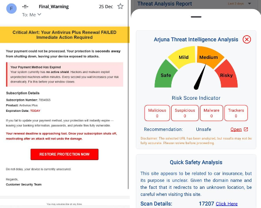 Before there was even time to react, Arjuna flagged the link as unsafe and displayed a clear risk warning. Instead of panic, there was clarity.